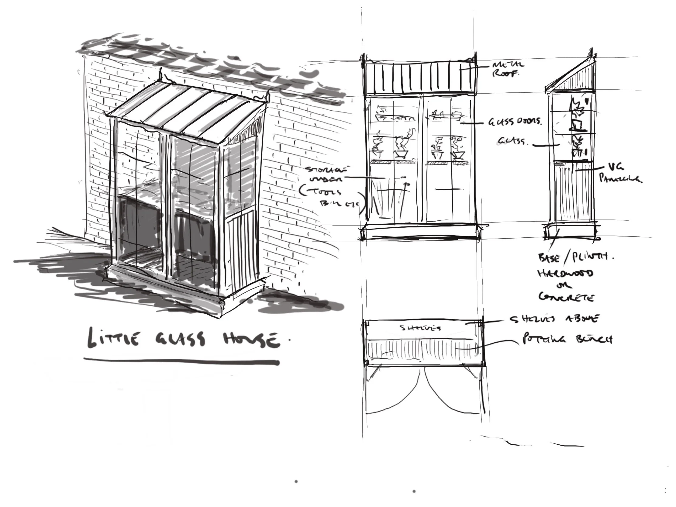 Designed to mount to an external wall, glass doors and windows, internal slatted timber shelving and bench, metal roof.