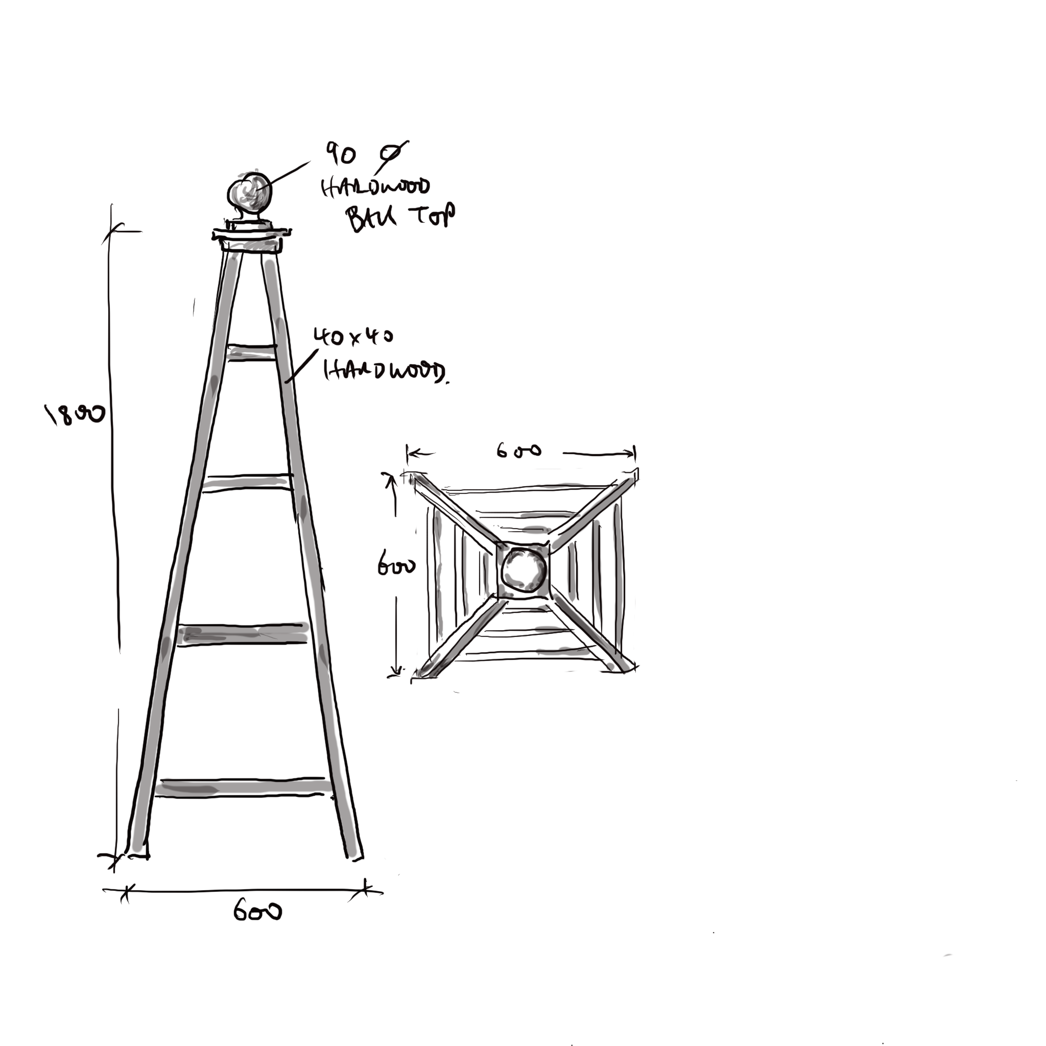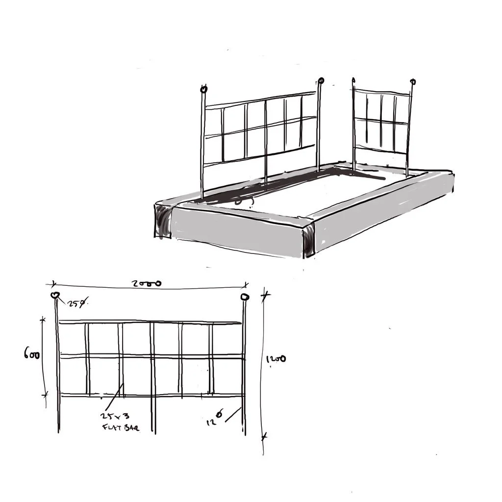 Steel frame painted with decorative detail to match the Baker’s Stand. topped with copper or timber work surface. side rails for hanging tea towels, can be fitted with mesh shelf below or kept open for stools. Size can be customised.