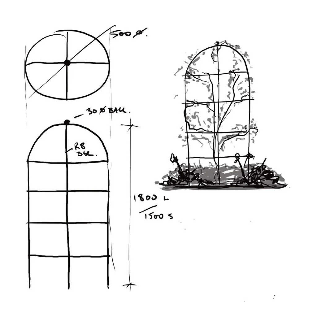 Decorative steel trellis for use as garden trellis. It can be used on theedge or centre of beds to string up plants needing support.