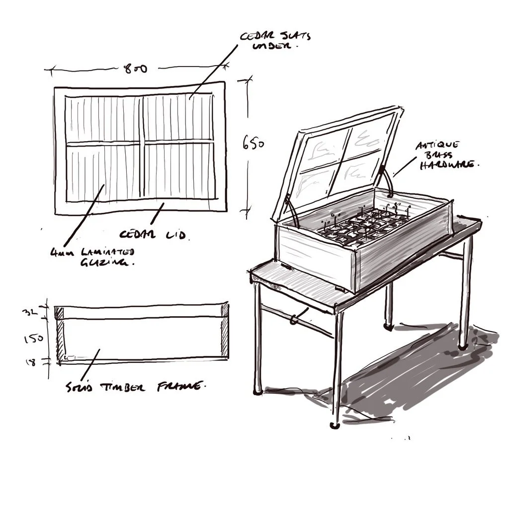 Cedar propagation box based on the concept of a very mini greenhouse. slatted base for drainage, glass lid for retaining heat and moisture, fitted with propagation trays & antique brass hinge stays.