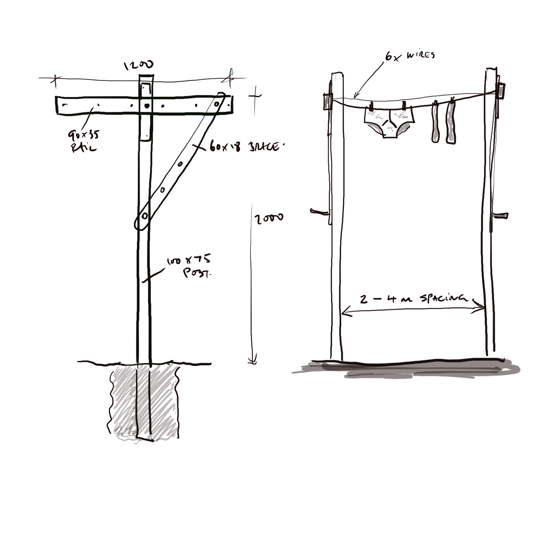 Traditional hardwood clothes line with wires and adjustable peg holes, supply only.